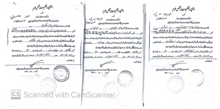 انسداددہشتگردی عدالت کے سیکشن 87 کے حکم نامے کی روشنی میں نوٹسز آویزاں کیے گئے ہیں۔